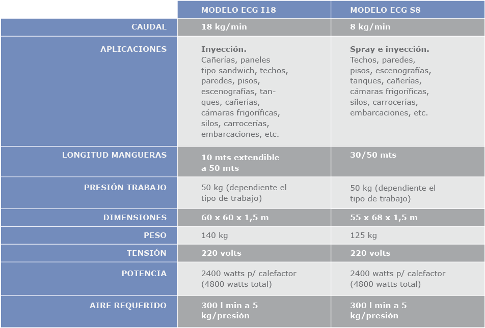 -calefactores poliol-iso: uno para cada  componente, controlados por termostato, cada  calefactor consume 2400 watts. Requerimiento  máximo de aire comprimido 3lts/min a 5  kg /cm2.